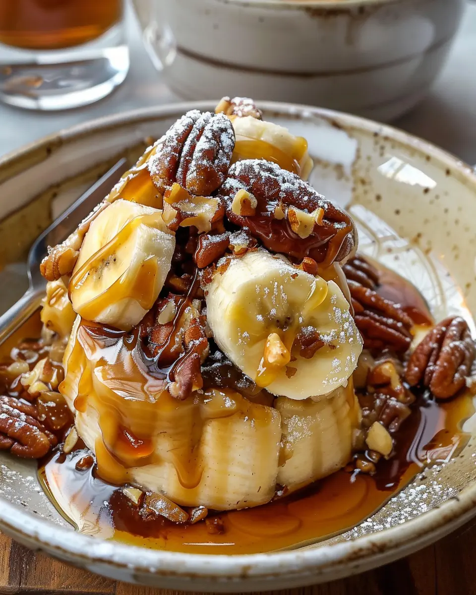 Indulge in a delicious twist on the classic banana foster dessert, featuring crunchy pecans and a rich caramel sauce.