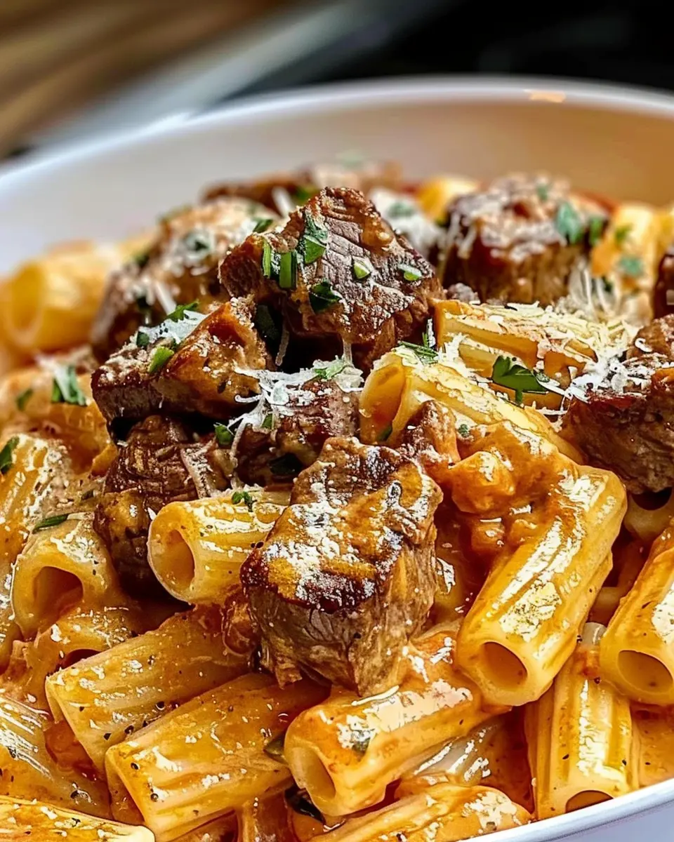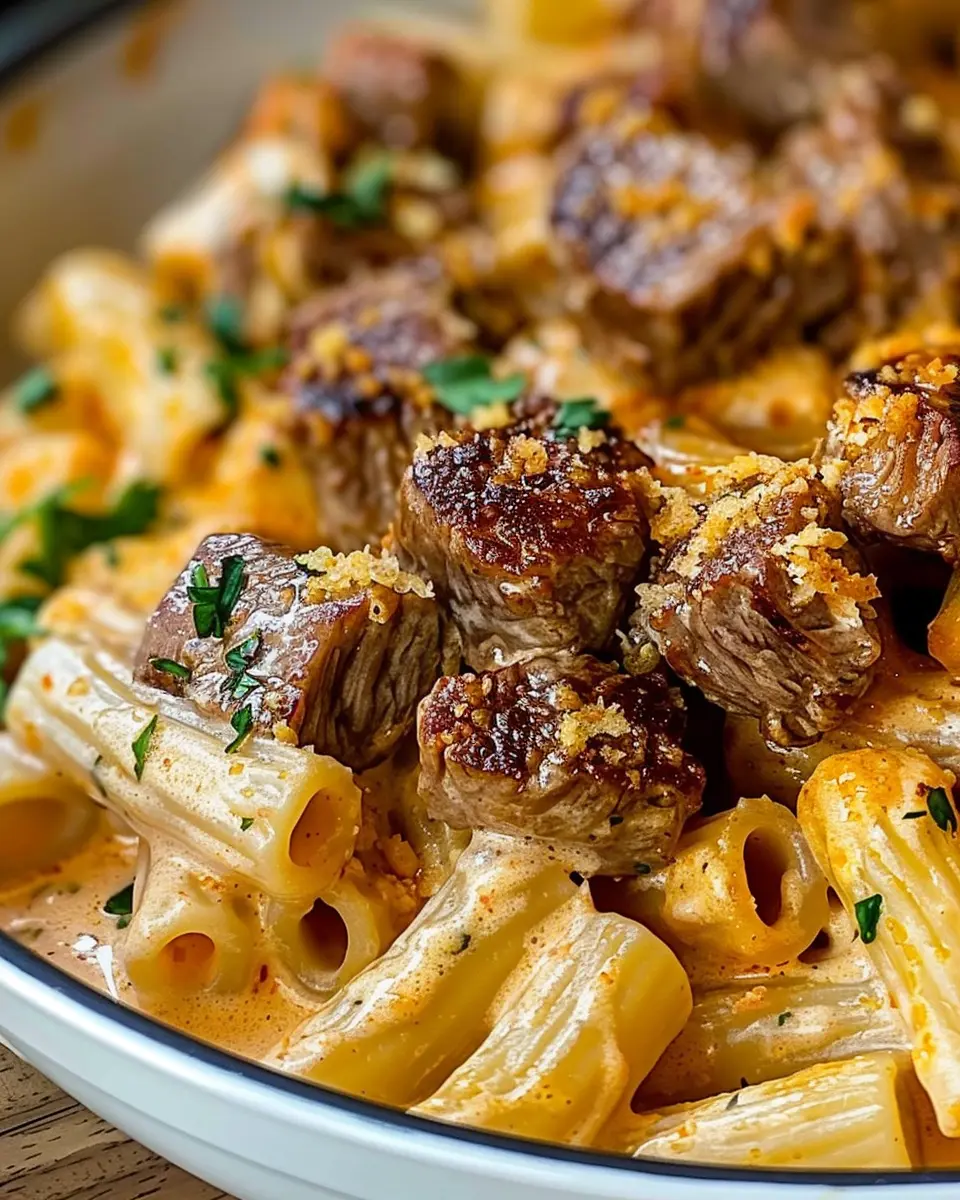 Cajun Steak Tips in Cheesy Rigatoni Parmesan Sauce is a rich and hearty dish that combines perfectly cooked steak tips with creamy rigatoni, topped with a generous sprinkling of parmesan. Ideal for comforting meals!