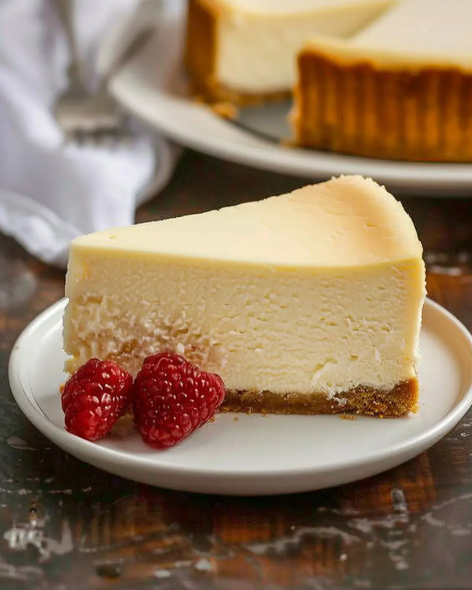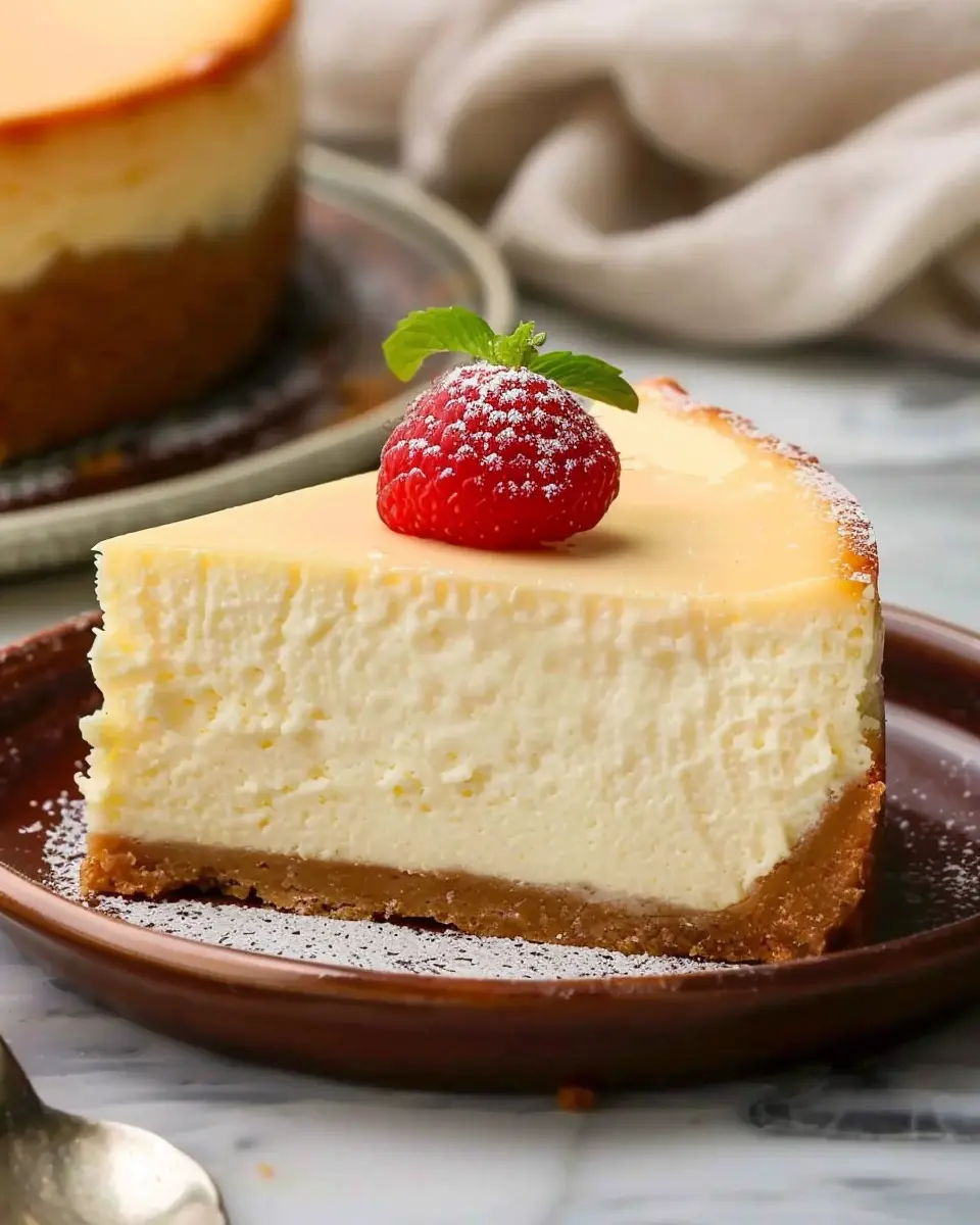Indulge in the rich and creamy texture of a classic New York cheesecake, made with simple ingredients for the perfect homemade dessert.