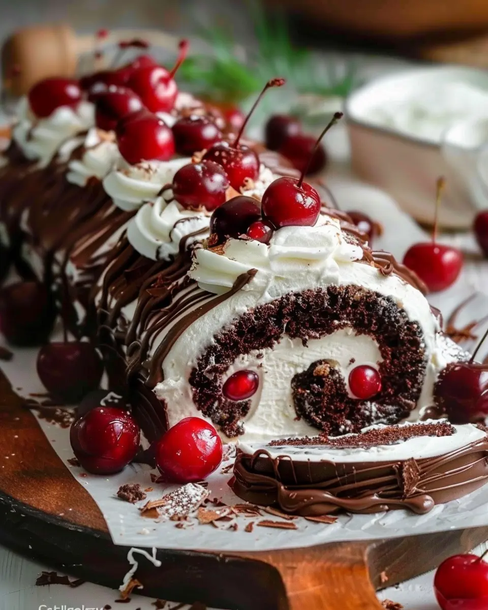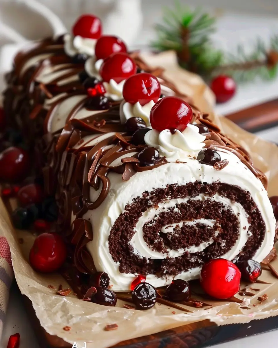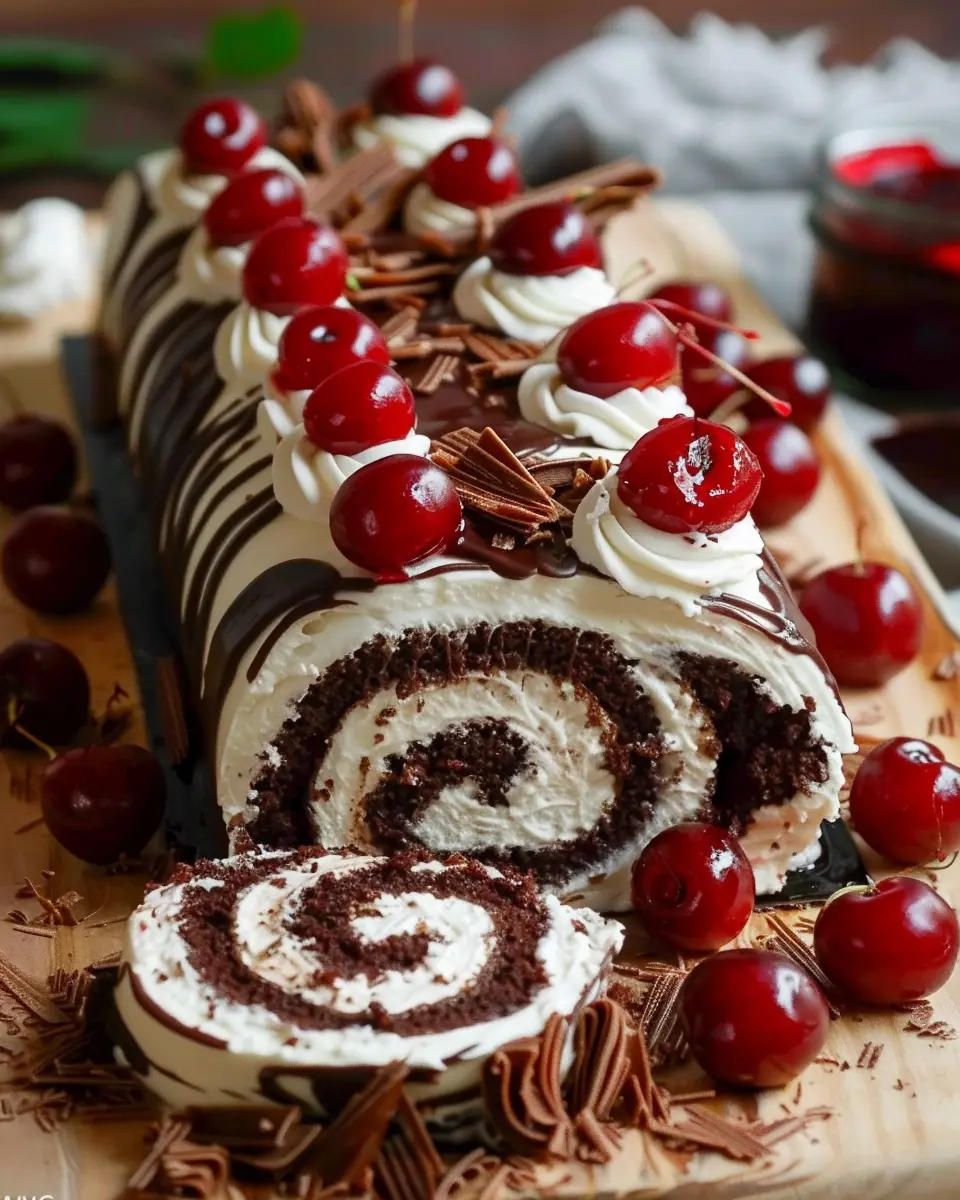 An elegant twist on the traditional Black Forest cake, this cake roll combines rich chocolate, cherry, and creamy frosting for a delightful dessert experience.