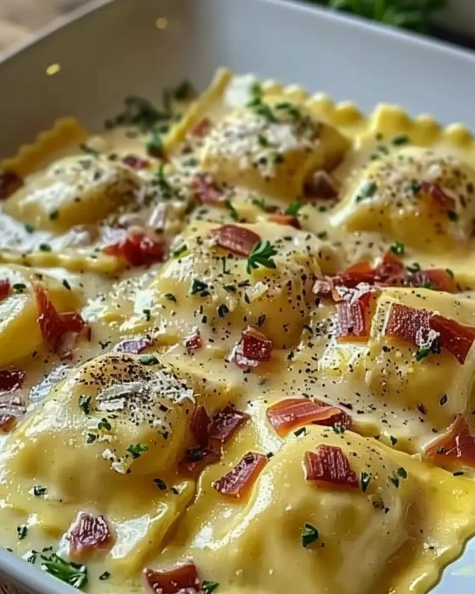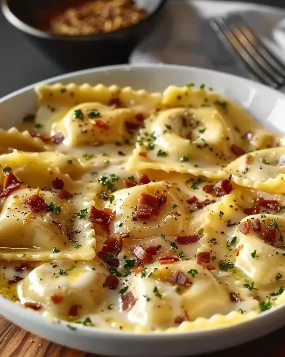 A creamy and delicious Olive Garden-inspired ravioli carbonara made with turkey bacon, perfect for a comforting meal.