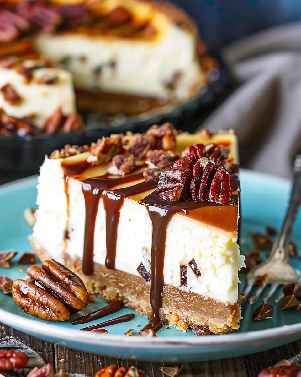 Indulge in a rich and creamy turtle cheesecake that blends chocolate, caramel, and pecans for a truly delicious dessert.